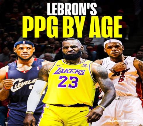 有媒體BronMuse統計并公布了詹姆斯從出道的18歲到41歲生日前的40歲,每個年齡段的最高得分。其中18歲最低,只有37分,當時詹姆斯才出道。40歲還有42分。最高是29歲,61分。第二低反而在巔峰期,大概因為不需要發力,34歲、39分。其他都是40分、50分這個區間。CLUTCHPOINTS統計的是每個年齡段的場均得分,18歲是20.2分,最低,21歲最高,30.2分,37歲是30.1分,40歲是24分,其他是25、26、27、28、29分。
