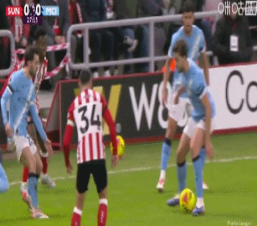 第34分鐘,福登橫傳失誤,馬延達打門踢偏