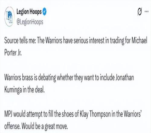 北京時間1月12日,美媒Legion Hoops報道稱,金州勇士隊對交易得到小邁克爾-波特抱有濃厚興趣。勇士管理層正就是否將庫明加納入交易籌碼展開討論。小波特將力爭填補克萊在勇士進攻體系中的空缺。這筆交易若是達成,將會是一步妙棋。