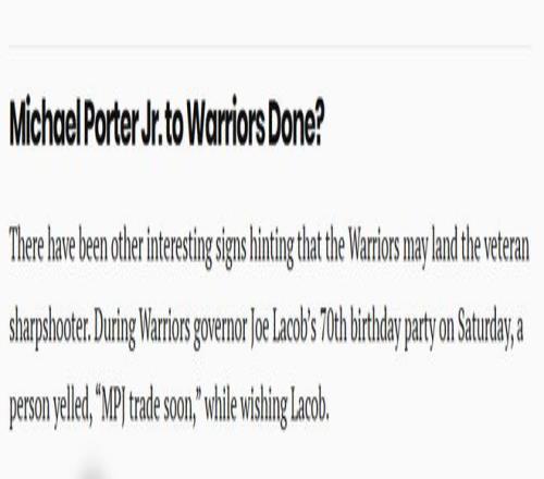 還有其他有趣的跡象暗示,勇士可能已經接近得到小波特。在勇士老板喬-拉科布的70歲生日派對上,有人在向拉科布送上祝福時大喊:“很快就會有小波特的交易了。”